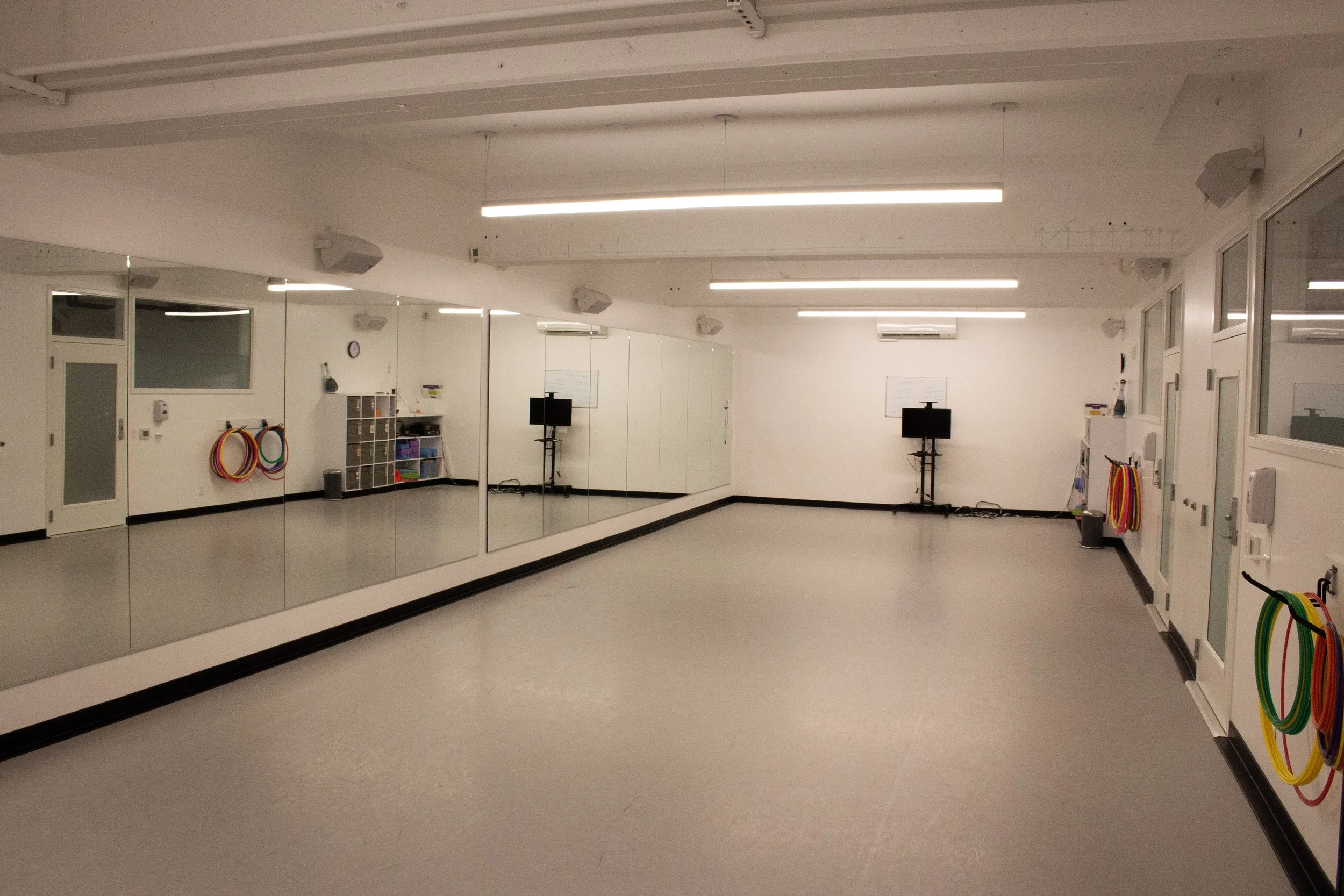 All of our studios have a sprung dance floor with a vinyl topping. This flooring can accommodate genres such as Tap, Modern, Jazz, Lyrical, Ballet, Hip Hop, Ballroom, Pop Styles, and others. Each studio space is equipped with an audio system with device connections. A TV monitor can be made available for the duration of the event by request.